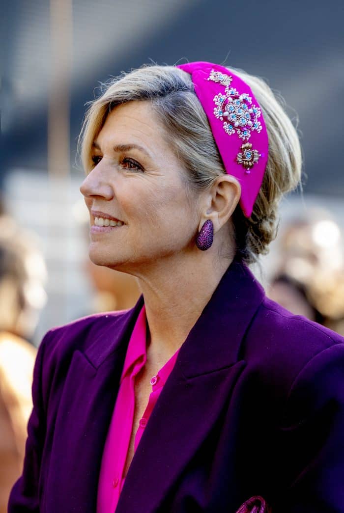 Voor de dag van hot naar her zocht Máxima een comfortabel pak met succesgarantie uit. De paarse set van Zara werd in 2022 uitgeroepen tot winnende outfit van het jaar. Waar ze bij het debuut in Zweden de felroze haarband combineerde met losse lokken, koos ze nu voor een opgestoken coupe. Anders dan gebruikelijk werd het haar op het achterhoofd getoupeerd, waardoor de haarband meer in het blonde haar viel. Het resultaat deed me een beetje denken aan de bekende Grace Kelly-rol.