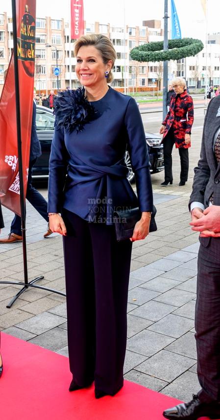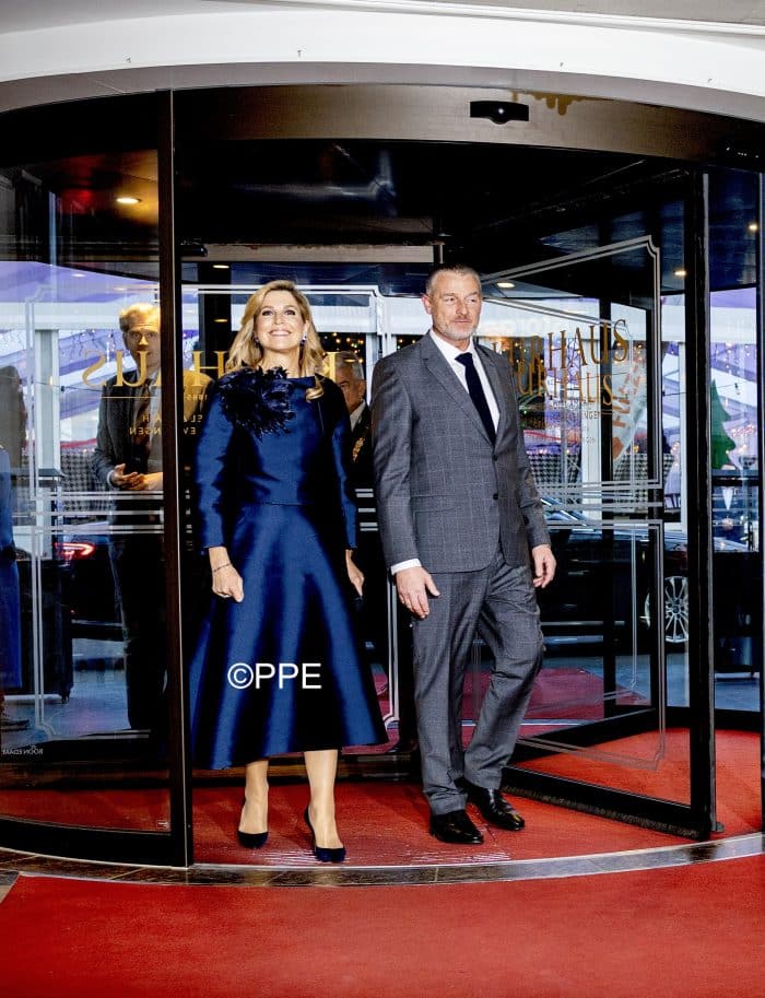 Vanochtend was koningin Máxima nog in Amsterdam. Speciaal voor deze gelegenheid heeft Máxima zich echter omgekleed. Ze gaat hier echt op chique. Een donkerblauwe satijnen midirok van Natan met een bijpassende korte donkerblauwe satijnen blousetop van Natan. Ook de decoratie met veren is afkomstig van het Belgische modehuis.