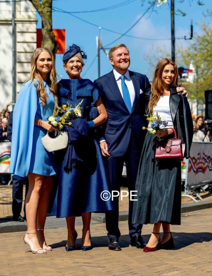 In mei zagen we Máxima ook met een donkerblauwe satijnen rok van Natan. De rok lijkt daar iets minder wijd, dus waarschijnlijk gaat het om Máxima’s satijnen rok van koningsdag in Doetinchem, eveneens afkomstig van Natan.