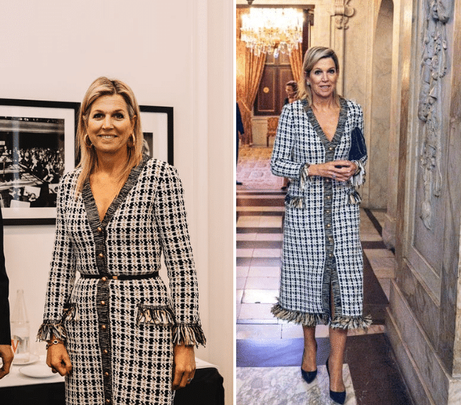 Voor de opening trok Máxima vanmiddag een bekende outfit aan. Haar franjejurk met lange knopenrij middenvoor komt uit een eerdere collectie van Oscar de la Renta.