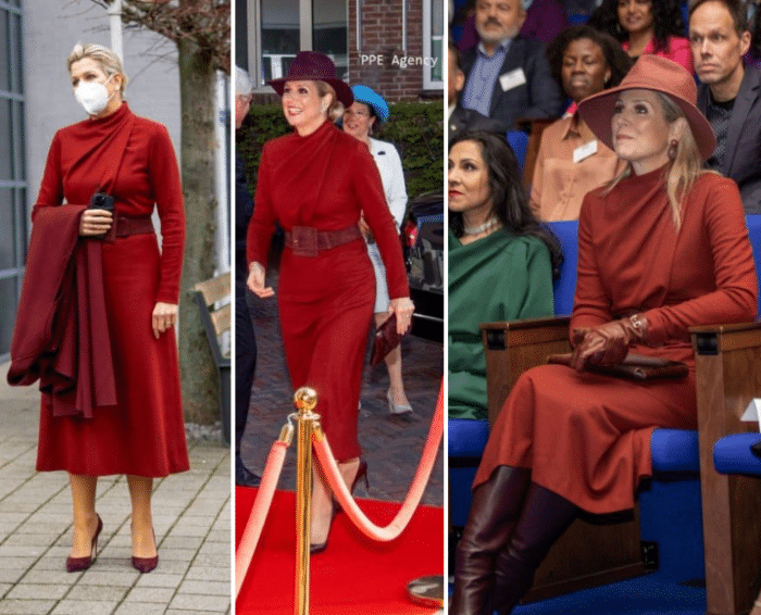 Máxima’s rode jurk met kunstig gevouwen kraag komt van het Belgische modehuis Natan. Het kledingstuk debuteerde in 2022.