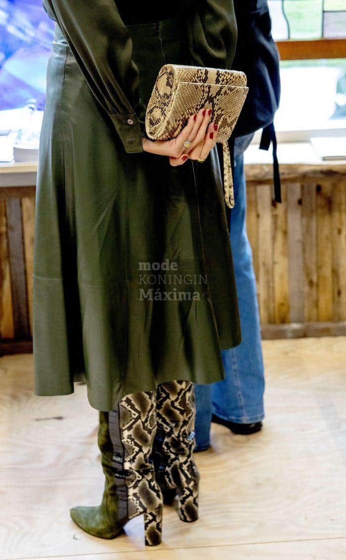 Voor het werkbezoek hulde Máxima zich van top tot teen in haar favoriete kleur: groen. De outfit is kleurig, klassiek en een tikkeltje zwaar. Om het geheel wat meer pit en lef te geven, combineerde ze het geheel met slangenleer. Naast een tas doken er ook opvallende laarzen op. De laarzen lijken nieuw, omdat we ze voor het eerst goed in beeld krijgen. Máxima droeg de complete outfit, met de laarzen, al eerder tijdens de ontvangst van de president van Vietnam in 2022. Helaas is nog steeds het label van de laarzen niet gevonden. Iemand de gouden tip?