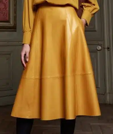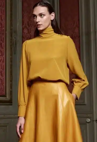 De blouse en de rok vind ik een heel mooi silhouet geven en zou ik zelf afstijlen met glanzenden, gouden sieraden.