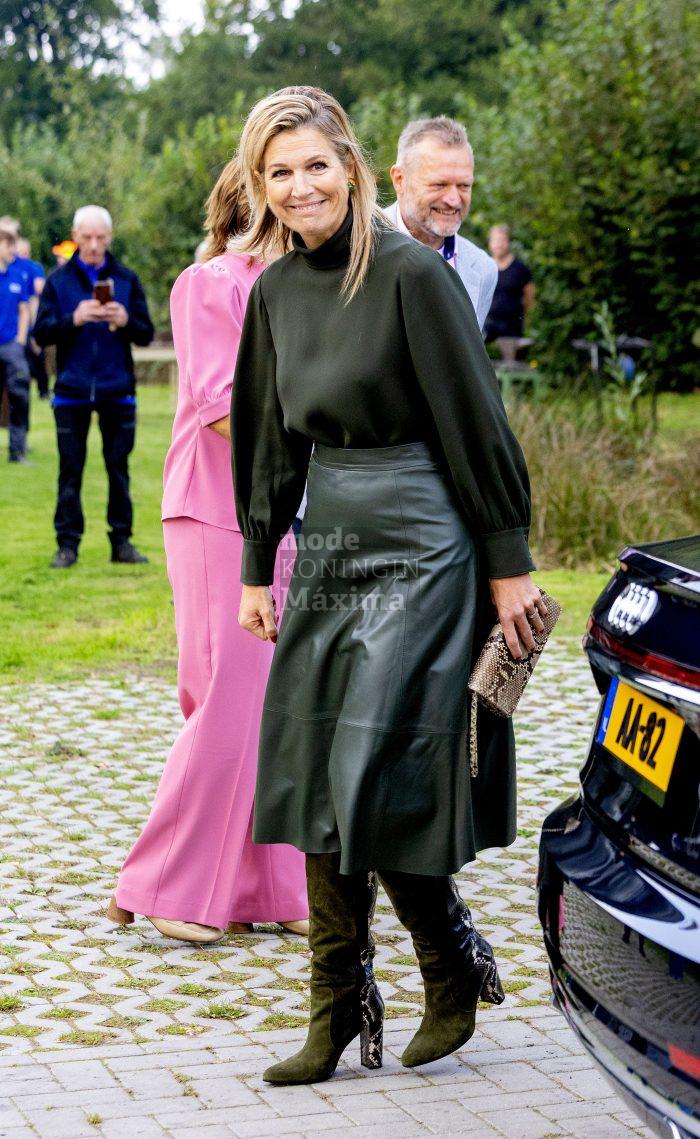Máxima’s donkergroene blouse en leren rok komen van Natan Couture.