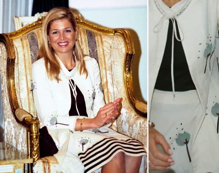Als ze in de zomer van 2002 een bezoek brengt aan de Nederlandse Antillen, duikt de set van Marni opnieuw op bij Máxima. Dit keer heeft ze haar blonde lokken samengebonden in een staart. De grijze kleur van de geborduurde bloemen komt terug in de brede armbanden om haar pols.