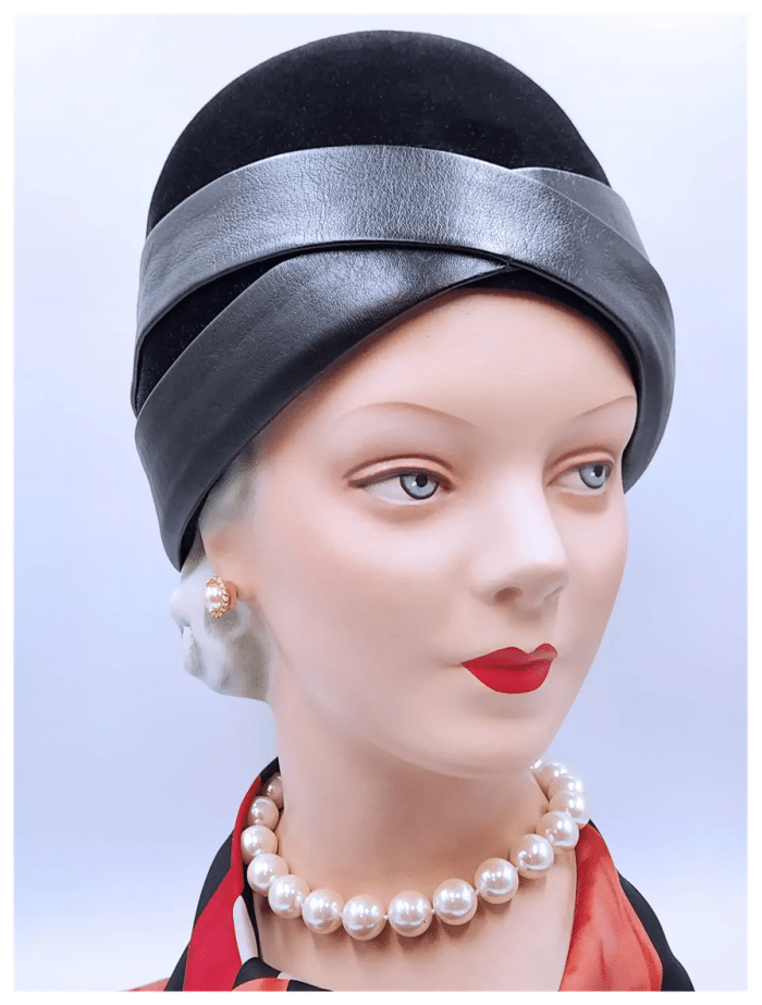 In de jaren zestig werd de mode strakker, en daarmee de hoeden minimalistischer. De hoed die in deze blog centraal staat, is daar een goed voorbeeld van. Het ontwerp bestaat uit een bolvormige hoed, die door het ontbreken van een rand doet denken aan de dophoedjes die je destijds ook veel zag. Bij de rand is het ontwerp voorzien van twee stroken leer, die elkaar aan de voorzijde kruisen. In Máxima’s hoedenkamer is een sterk vergelijkbaar ontwerp te vinden. Ze droeg hem voor het eerst tijdens de Nationale Dodenherdenking van 2011.