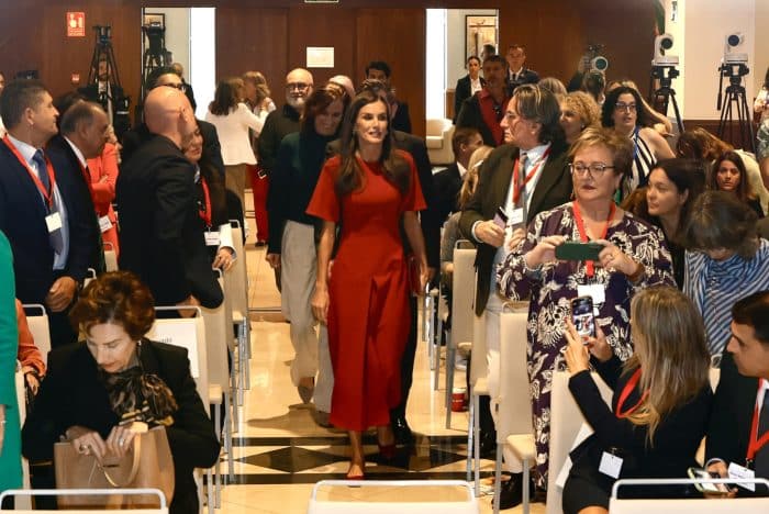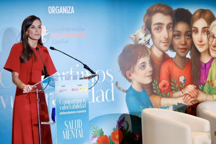 Koningin Letizia zat het institutionele evenement voor dat werd georganiseerd door de Spaanse Confederatie voor Geestelijke Gezondheidszorg ter gelegenheid van “Werelddag Geestelijke Gezondheid 2025”. Daarbij droeg ze een fleurige rode A-lijn jurk (Adolfo Dominguez).