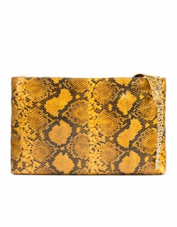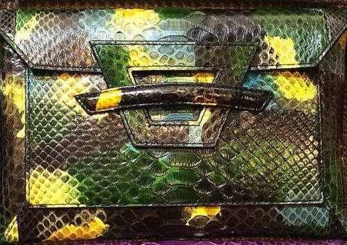 Volgende vraag: heb je weleens een slang in felgeel/donkergroen camouflagepak gezien? Nee, ik ook niet. Behalve als ik met een beetje fantasie kijk naar Máxima’s walk-in closet. Net als het tasje hierboven betreft dit ook een Moneypenny van Sophie Hapsburg.