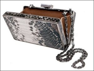 Tasje nummer 1 komt overigens van modehuis Natan. Het model is recht toe, recht aan, met een flap en vermoedelijk een slanglederen print. Geen echt slangenleer, dus. Hieronder een close-up.