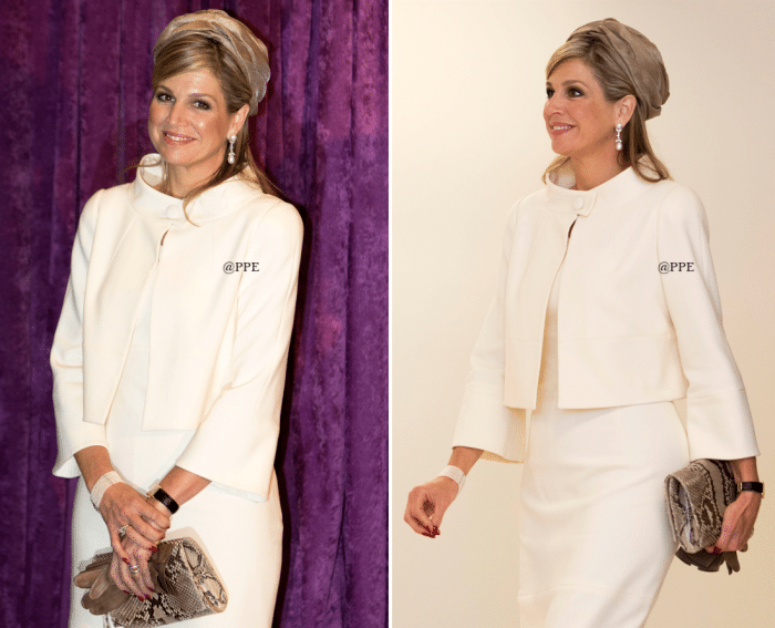 Hoe voorzie je een klassieke koninginnejurk van een moderne touch? Máxima weet daar wel raad mee. Bij haar uniform draagt ze vaak en graag een tas met een dierenprintje. Dat er in haar walk-in closet veel wilde tassen te vinden zijn, is dan ook niet zo verwonderlijk. Een mooi voorbeeld van Máxima’s tassentruc zie je op de collage hieronder. Het witte pakje van Natan ademt de klassieke stijl van de jaren ’60. Door de grote knoop en het korte jasje zou hij zo uit de garderobe van Jackie Kennedy kunnen komen. Het grijze slangentasje geeft een stoere, moderne touch aan het geheel, waardoor het niet té keurig wordt voor onze flamboyante koningin. Waarom ze dit pakje slechts één keer heeft gedragen, vind ik overigens heel opmerkelijk. Misschien mag hij mee in de koffer naar Suriname? Of volgende maand naar Indonesië?