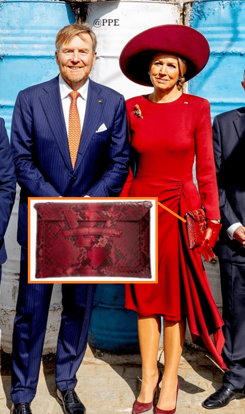 Ooit een bordeauxrode slang gezien? Nee, ik ook niet. Dankzij moderne technieken kan het slangendessin echter in alle kleuren van de regenboog worden weergegeven. Bijvoorbeeld in het rood. Máxima’s moneypenny van Sophie Habsburg is daar een goed bewijs van.