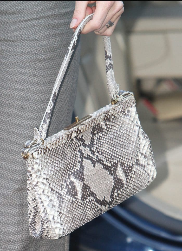 Bij Uterqüe kocht Máxima een rechthoekige clutch met het dessin van slangenleer. Koningin Letizia heeft hem ook in haar walk-in closet liggen.