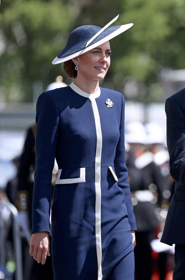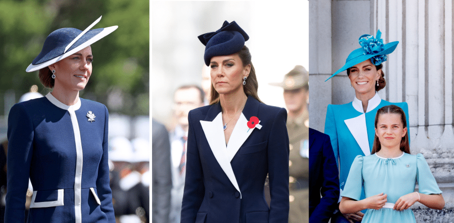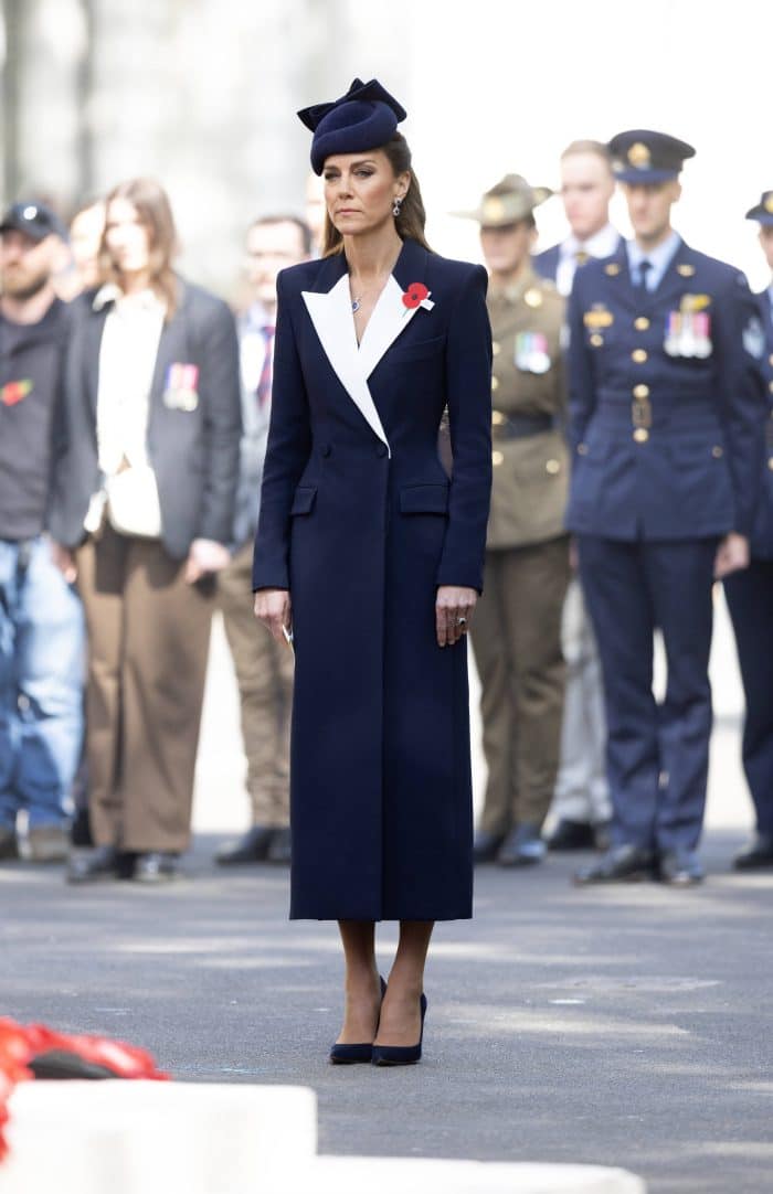 Op zaterdag was de Prinses van Wales aanwezig bij een kranslegging en militaire parade. Passend bij de plechtige ambicance, droeg ze een lange, donkerblauwe mantel. Maar waar mijn oog direct op viel, was de keuze voor de sneeuwwitte revers. Met dit accent bevestigt Catherine al langere tijd haar koninkijke positie.