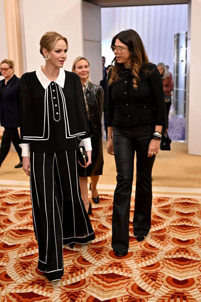 Prinses Charlène liet zich geïnteresseerd rond leiden langs de juwelen. Ze had haar haren mooi opgestoken, wat haar een zachte uitdrukking geeft.