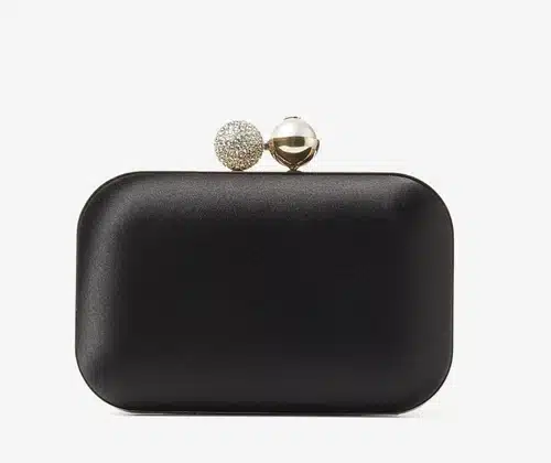 De zwarte satijnen clutch (label: Jimmy Choo) en haar zwarte slingback pumps (label: Salvatore Ferragamo) passen perfect bij deze outfit.