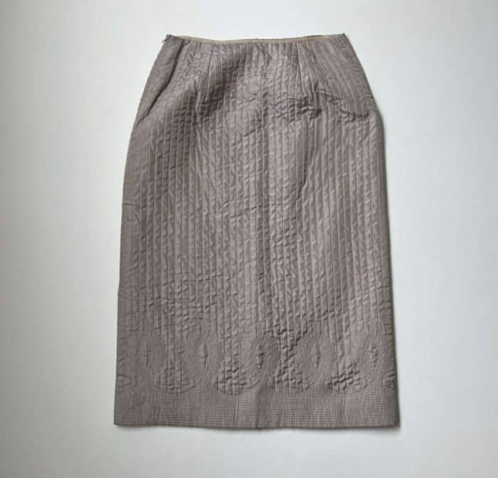 Bijzonder? Jazeker! Koningin Beatrix heeft namelijk als gastconservator de collectie gekozen, die op dat bewuste moment tentoongesteld wordt. Eén van de gasten die door fotografen wordt gespot is Máxima Zorreguieta, wandelend naast prins Willem-Alexander. Máxima draagt een jurk van een glanzende stof met verticale stiksels en een geometrisch geborduurd patroon. Daaroverheen draagt ze een jasje dat is gemaakt van dezelfde stof. Precies 25 jaar na het debuut is het label achter de set nu gevonden: Max Mara.