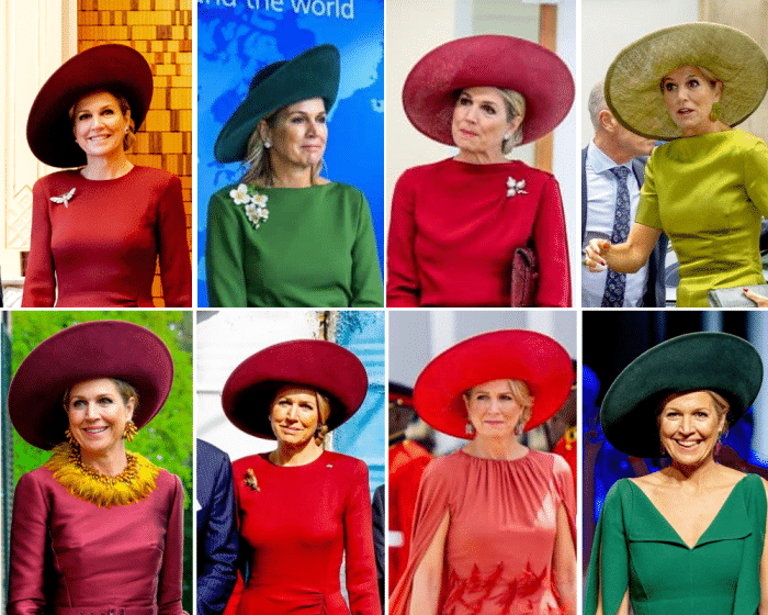 Vroeger, en dan doel ik op zo’n vijftien jaar geleden, droeg Máxima een scala aan modellen en materialen. Anno 2025 heeft ze een duidelijke voorkeur voor bepaalde categorieën. Zo is de relevé, een hoed met een opgeslagen rand aan de voorzijde, haar absolute favoriet. In 2025 kwam het model 11 keer in beeld. Allemaal komen ze van Fabienne Delvigne.