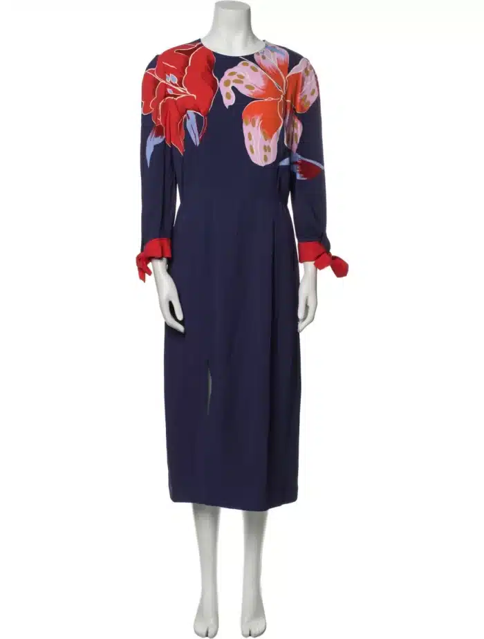 Koningin Mathilde koos bij deze gelegenheid voor een donkerblauwe jurk van Etro, met enkele opvallende grote bloemen aan de voorzijde.