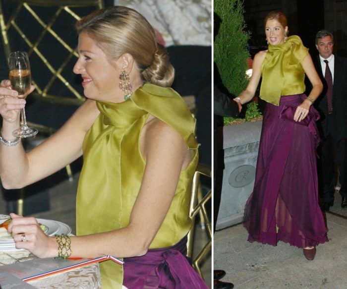 Een jaar later, als Máxima net zwanger is van de eerste, komt de groen-gele set opnieuw in beeld. Ditmaal tijdens een bezoek aan New York in mei 2003. Máxima combineert de hoge halslijn nu met een laagopgestoken knot.