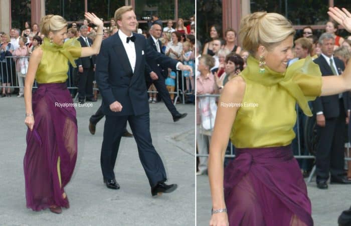 Máxima kende haar al voor ze verliefd werd op Willem-Alexander. Haar moeder, Maria del Carmen Cerruti, kocht een deel van haar nette goed bij Naum. De eerste bestellingen van de toekomstige prinses bestonden uit rechte rokken en wijde, keurige blouses. Maar naarmate Máxima’s ervaring, inburgering en zelfvertrouwen toenamen, nam ook haar modelef toe. En zo bestelde ze in 2002 een groene rok met een paarse overlaag en een top in dezelfde kleur groen. De set viel zo in de smaak, dat er ook een paars-rode versie werd aangeschaft. Helaas is die nooit publiekelijk gedragen.