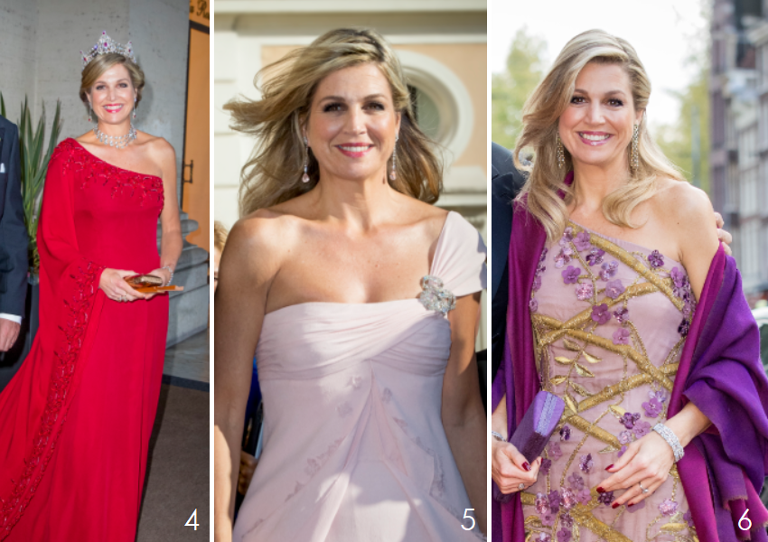 Diagonale lijnen kleden af. Onze mooie koningin heeft dat natuurlijk helemaal niet nodig, maar toch hangen er heel wat asymmetrische jurken in haar kledingkast. Een overzicht vanaf 2013.