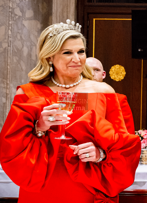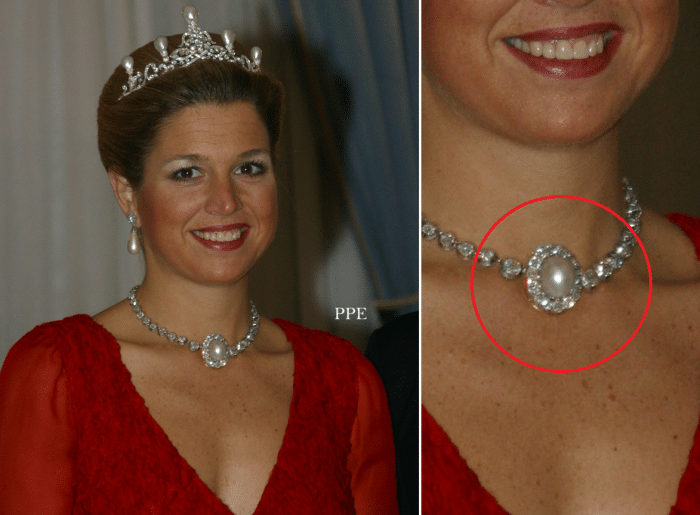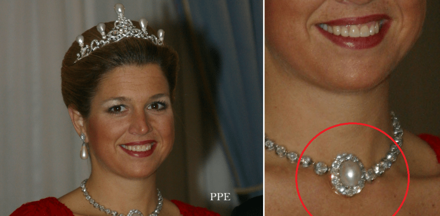 Tijdens een van haar allereerste staatsbanketten wist Máxima al alle aandacht naar zich toe te trekken. Hoe? Door het dragen van een imposant collier van diamant en parel. Het pronkstuk fónkelde om haar hals.