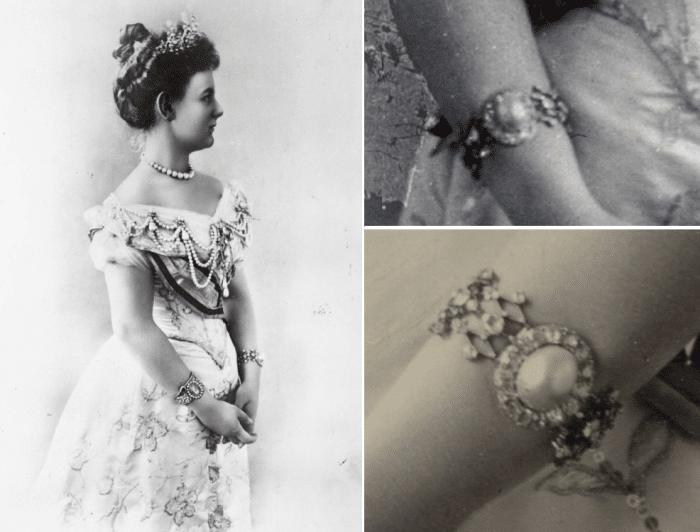 Hoe groot de parel is, zie je ook goed op de foto hieronder van een prachtige Wilhelmina in 1900. Qua grootte kan hij concurreren met een vogelei. De parel wordt omlijst door negen (old mine) diamanten. Wat je vast ook wel opvalt, is dat hij hier bevestigd is aan een armband. Dat brengt ons gelijk bij het grote pluspunt van de Oranjecollectie. Dankzij een ingenieus systeem van haakjes en schroefjes kunnen de juwelen als een soort luxe bouwpakket in elkaar gezet worden. En dus ook onderling gecombineerd worden.