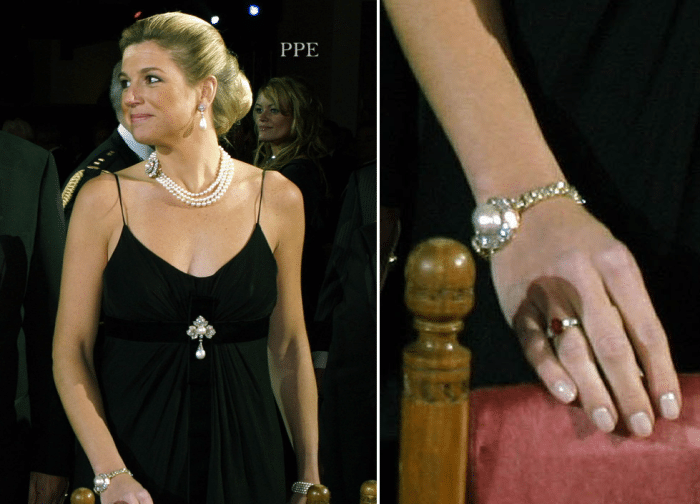 Máxima werd er voor het eerst mee gezien in 2002 tijdens het huwelijk van prinses Martha Louise van Noorwegen. Helaas heeft ze haar arm steeds in die van Willem-Alexander gehaakt, waardoor je het juweel bijna niet ziet.