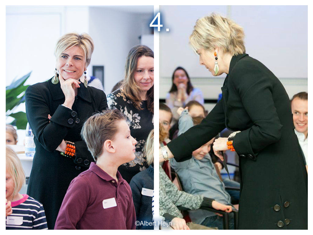 4. 6 februari 2015: Prinses Laurentien was met de Raad van Kinderen aanwezig bij het hoofdkantoor van Albert Heijn. Laurentien droeg een zwarte mantel, gecombineerd met oranje accessoires. Van de rest van haar kleding is helaas niet zoveel te zien.
