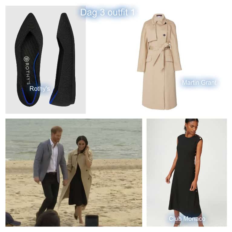 Outfit 1 – 18 oktober: Meghan ging gekleed in een zwarte jurk met knopenrij over de hele zijkant van de jurk. De jurk komt van Club Monaco. Haar zwarte flatjes zijn van Rothy's en ze draagt opnieuw haar camelkleurige trenchcoat van Martin Grant.