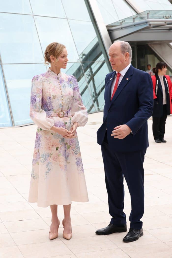 Zeg je Zimmermann, dan zeg je zachte, romantische jurken van soepele stoffen. De ontwerpen van het Australische label ruiken wellicht gewoon naar wasmiddel, maar als je er zo naar kijkt, verwacht je dat de geur van een vers boeket je tegemoet komt. Koningin Máxima en koningin Mary zijn al meermaals gespot met een Zimmermann en ook prinses Charlene is inmiddels fan. Waar ze voorheen koos voor strakke belijningen, harde kleurenpaletten en grensverleggende trends, kiest ze tegenwoordig voor compleet het andere uiterste. Tijdens de ontvangst van prinses Akiko van Japan verscheen ze in een zee van orchideeën ten tonele. Door het opstaande kraagje en de lange knopenrij was er ook sprake van een Japanse knipoog. Een chique opgestoken kapsel, met een gekrulde lok rond het gezicht, maakte het plaatje af.