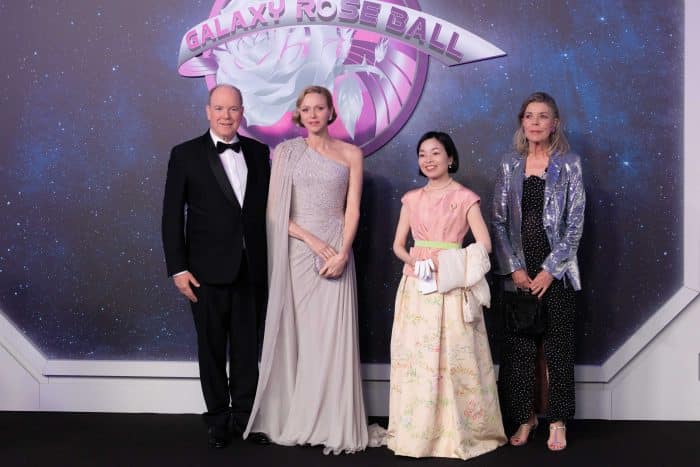 Naast de officiële verplichtingen was Prinses Akiko de eregast tijdens het glamoureuze Bal de la Rose. De dresscode was Galaxy Rose Ball. Gasten werden dus verwacht in outfits die doen denken aan de ruimte, sterrenstelsels en sciencefiction-chic. Denk aan metallic stoffen, pailletten die fonkelen als sterren, en iriserende materialen. De keuze van Charlene viel op een asymmetrische capejurk van Elie Saab.