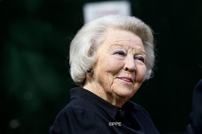 Prinses Beatrix droeg vandaag een zwarte broek met daarop een wat langer vallende zwarte blouse met verfijnd wit borduursel.