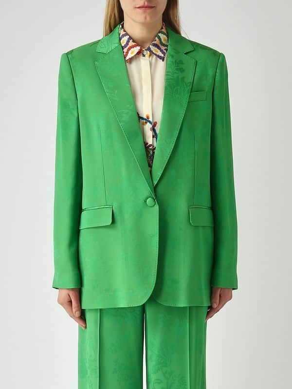 Prinses Laurentien draagt een groen broekpak met borduursel, met daaronder een blouse met opstaande kraag. Zowel het broekpak als de blouse zijn afkomstig van Etro via Hardies Mode uit Den Haag.