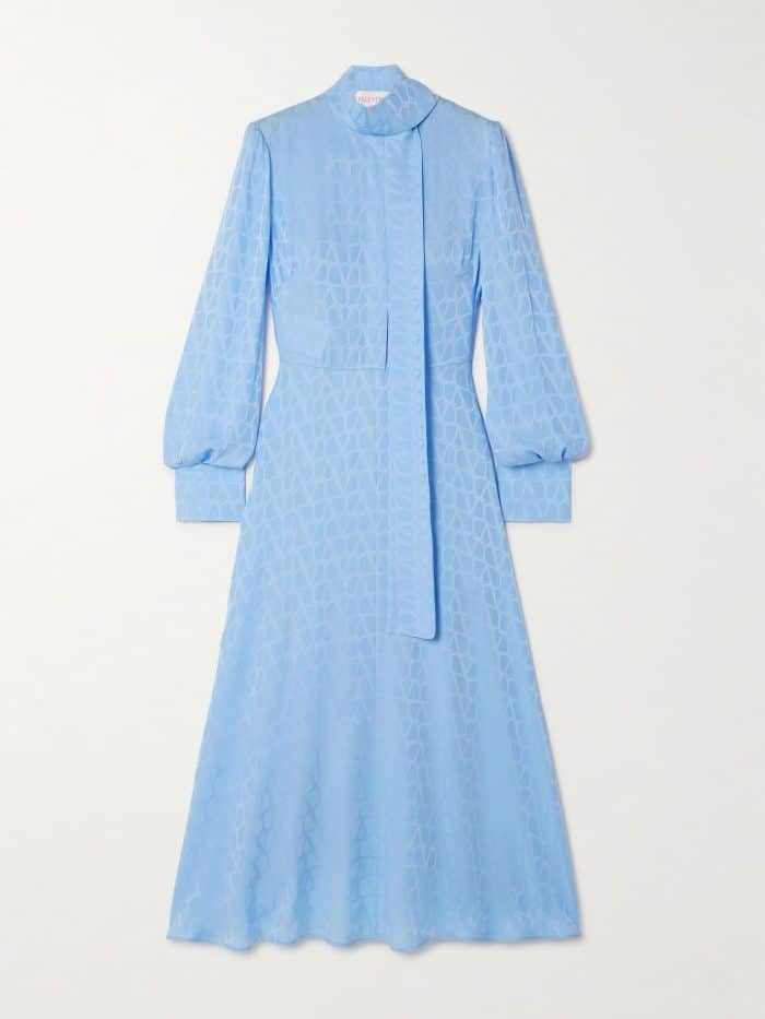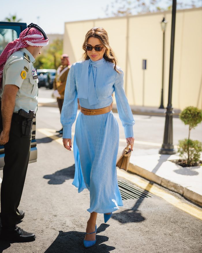 Koningin Rania koos voor een elegante lichtblauwe jurk van Maison Valentino.