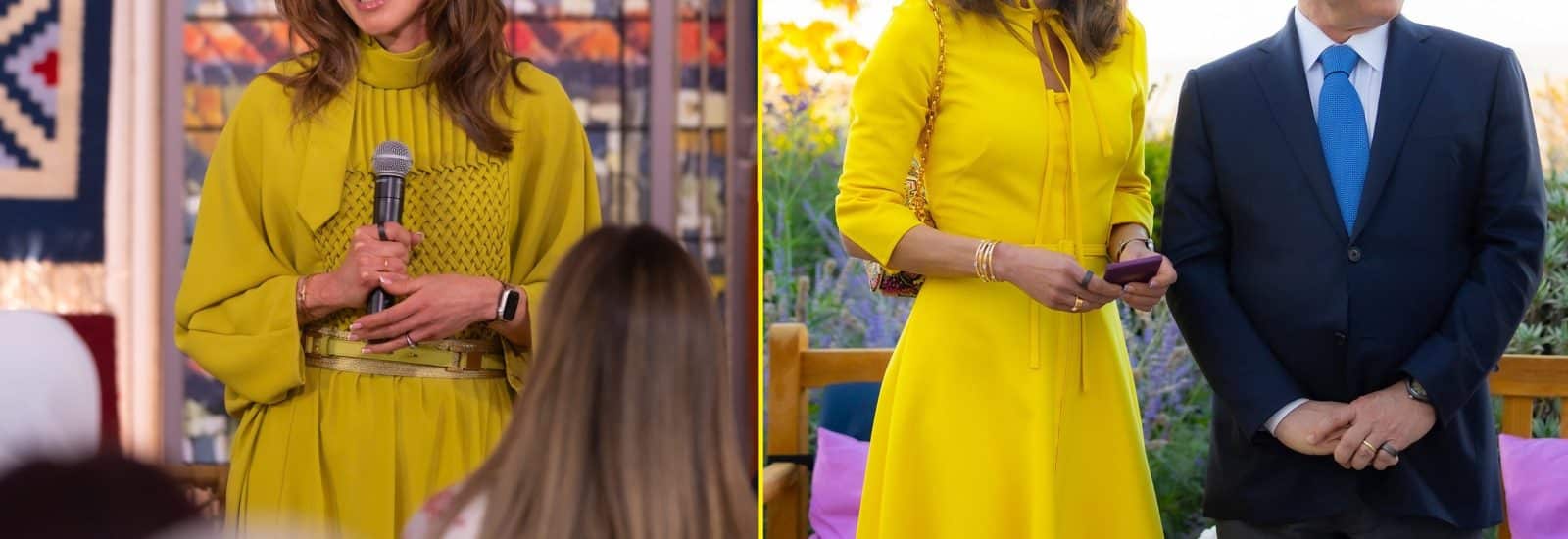 De afgelopen periode heeft Rania een paar keer een fel gekleurde gele en limegroene jurk gedragen. En dat staat haar geweldig!