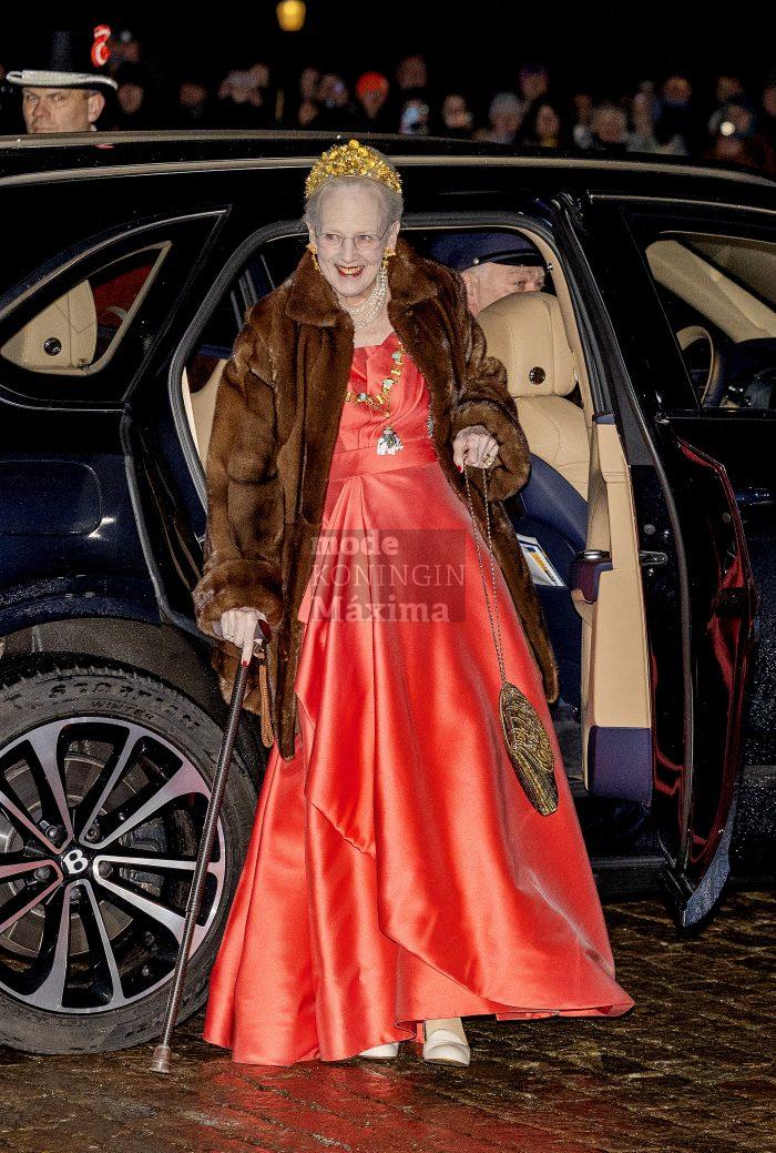 Koningin Margrethe draagt een eerder gedragen koraalrode japon. Op haar kapsel prijkt de gouden Naasut tiara.