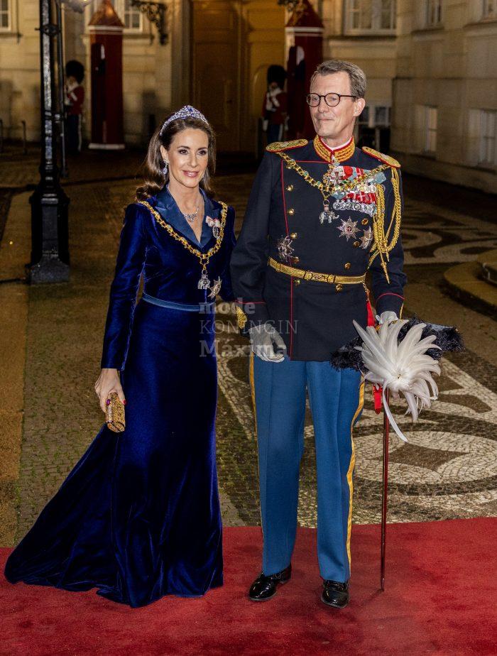 Prinses Marie, de echtgenote van prins Joachim, draagt een eerder gedragen donkerblauwe galajapon. Op haar losse kapsel prijkt de Nuits Claires tiara.