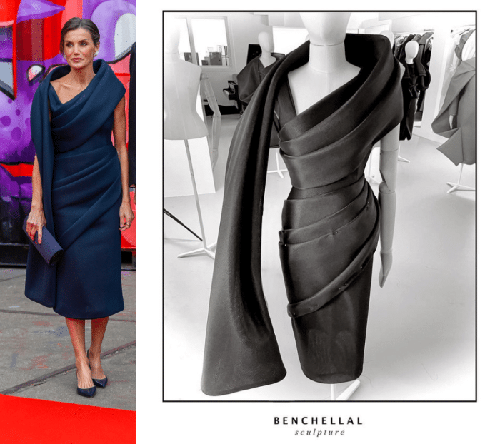 Mohammed Benchellal staat bekend om zijn sculpturale ontwerpen en mouleert ook veel. Ik kreeg ingefluisterd dat de wikkel om Letizia’s lijf uit één stuk bestaat.