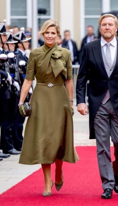Laten we naar wat mooie voorbeelden kijken. Tijdens het huwelijk van Albert en Charlene van Monaco droeg Máxima een okergele cocktailjurk, die bij het lijfje voorzien was van diagonale plooien. Ik vermoed dat de ontwerper, Edouard Vermeulen, door middel van mouleren de bovenlaag heeft aangebracht. Zo kon hij mooi Máxima’s slanke taille benadrukken.