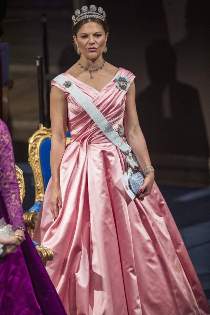 Door naar het volgende pareltje. Tijdens de Nobelprijzen 2022 droeg Victoria een gemouleerde jurk van Camilla Thulin. De plooien van het lijfje, vloeien vanaf de taille uit in een wijde rok. Als ik naar deze jurk kijk, kan ik de coupeuse in gedachten aan het werk zien. Peinzend wat hij/zij met de onderste plooien moet doen, om te voorkomen dat ze uitlopen in een punt. Je ziet dat de stof onder de boezem een andere lijn volgt, zodat alle stof vanaf de taille uitwaaiert.