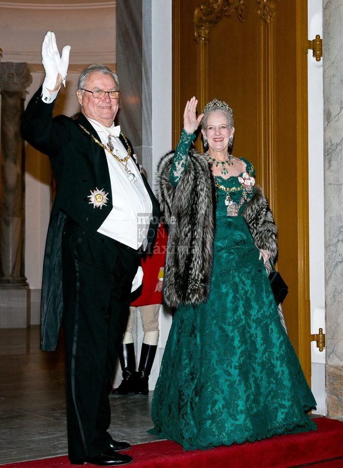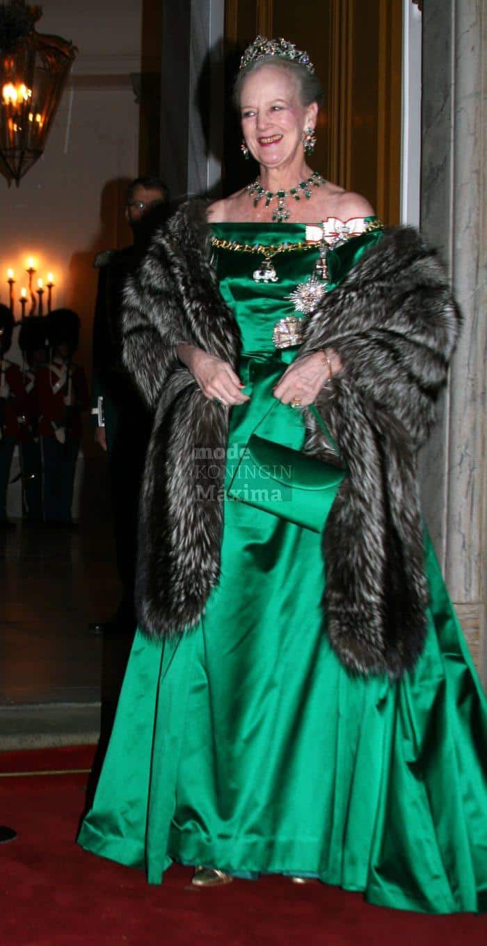 Daarnaast heeft koningin Margrethe deze kanten galajapon, die wat recenter is. Ook heeft ze nog een ‘gif’groen exemplaar.