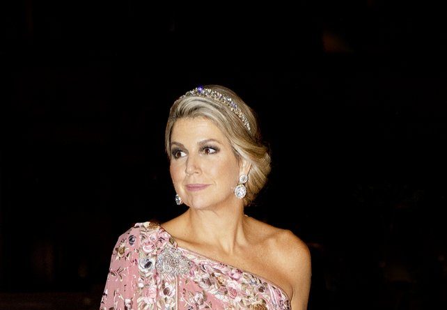 Tijdens het staatsbanket draagt de koningin een nieuwe avondjurk, die is gemaakt van een Indiase sari. Of beter gezegd: een sari uit Jaipur, oftewel: de roze stad. Máxima kocht de sari zelf tijdens het staatsbezoek aan India in 2007. Twaalf jaar later mocht Jan Taminiau de schaar in de souvenir zetten, met een asymmetrische avondjurk met draperie als resultaat. Ik vind het oogverblindend mooi.