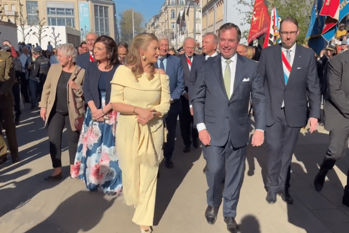 Qua kleding kiest groothertogin Stéphanie vandaag voor een jumpsuit in een pastelkleur die helemaal van nu is: botergeel. Haar jumpsuit is een ontwerp van Modehuis Natan.