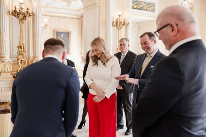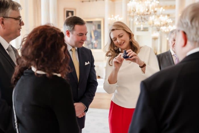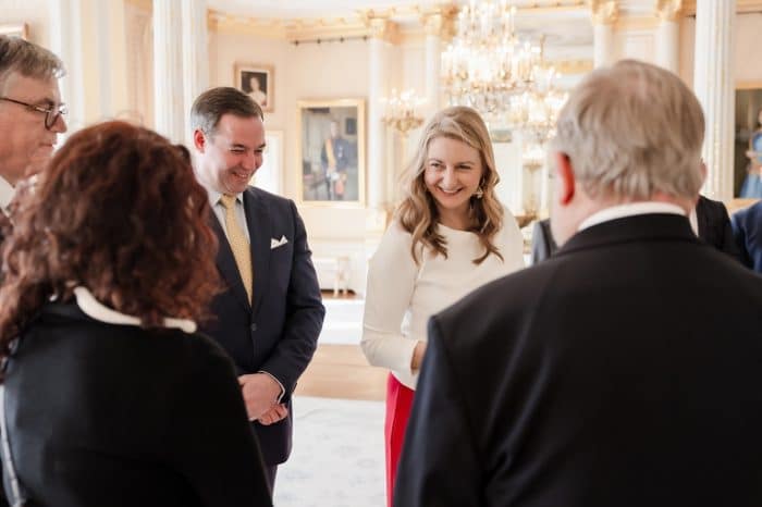 Groothertogin Stéphanie liet een fleurige look zien, bij de ontvangst van deelnemers aan een Paasevenement. Maandag wordt de ambachtsmarkt gehouden.