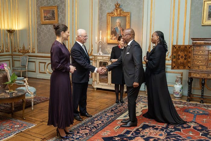 In Zweden gaven koning Carl Gustaf en kroonprinses Victoria een diplomatieke receptie voor buitenlandse gezanten in het Koninklijk Paleis. Kroonprinses Victoria koos voor een aubergine plissérok met een bijpassende blouse.