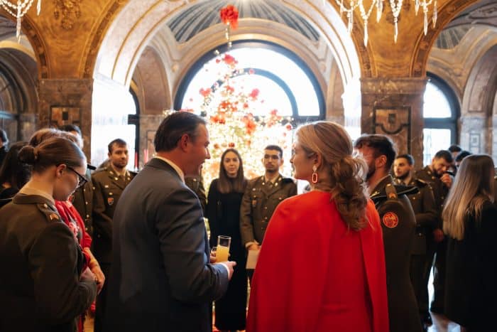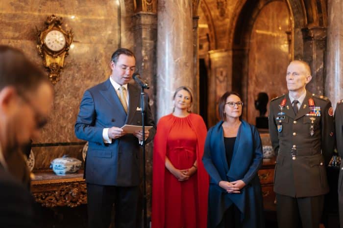 Wat staan deze diepere kleuren Stéphanie toch goed! Deze week hield het groothertogelijk paar een receptie ter ere van de “Vredesmissies”. In kasteel Berg brachten Guillaume en Stéphanie hulde aan de leden van het Luxemburgse leger en de politie, die deelnamen aan internationale missies. Ook hun families, die de lange reizen naar het buitenland ondersteunen, waren uitgenodigd. Tijdens deze receptie zagen we groothertogin Stéphanie in een rode jurk, die overduidelijk afkomstig is van Modehuis Natan.