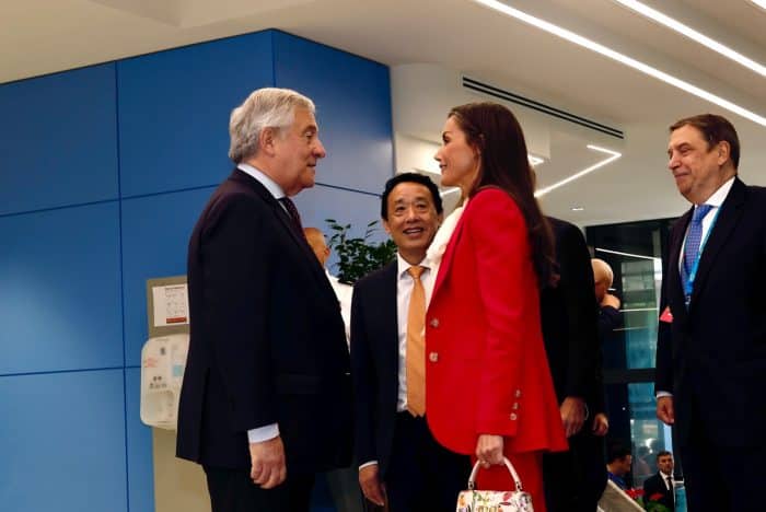 Letizia is weer, zoals gewend, zeer verzorgd gekleed, ik vind de witte blouse mooi, maar niet zo bij dit felrode pak, ik weet niet waarom ik er niet weg van ben, want rood met wit is altijd prima,maar misschien door de grote strik net iets te veel …..