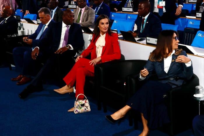 Een ontmoeting met de Paus in het felrood, is absoluut vernieuwend. Ware het niet, dat Letizia niet bij de Paus zelf op audiëntie kwam, maar hem ‘slechts’ ontmoette tijdens een evenement van de Wereld Voedseldag. Vernieuwend is vooral haar tas (Toni tas van het label Furla). Een tas met bloemen, dat is niet iets wat je zo 1-2-3 bij koningin Letizia zou verwachten. En dát bij een broekpak (label: Carolina Herrera). In combinatie met de strikblouse, zorgt het voor een elegant plaatje. Chapeau!