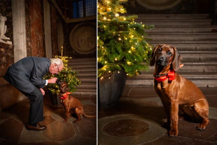 Vanuit paleis Drottningholm sturen koning Carl Gustav en koningin Silvia, samen met hun nieuwe hond Bonnie, vandaag hun kerstgroet. De koning, de koningin en Bonnie zijn gefotografeerd bij de grote trap van paleis Drottningholm.